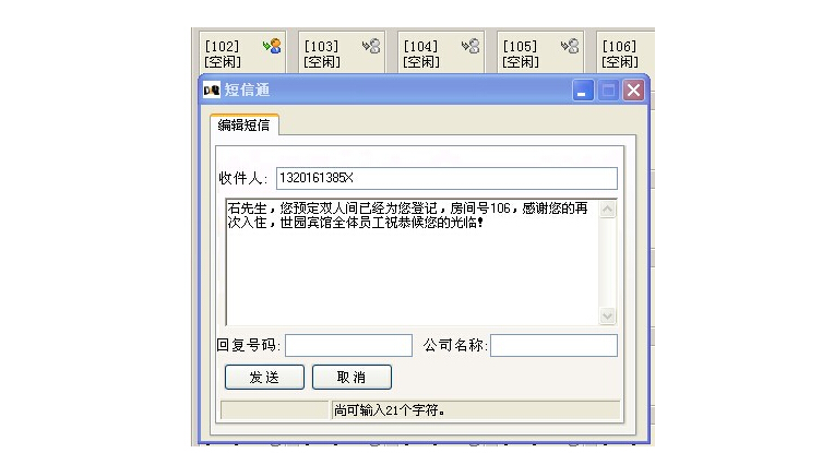 TDMx-2000D接入C網(wǎng)或者G網(wǎng)的無線中繼后,PC話務(wù)臺(tái),可以點(diǎn)短信發(fā)送,將編輯好的訂房等信息直接發(fā)送到客戶的手機(jī)上