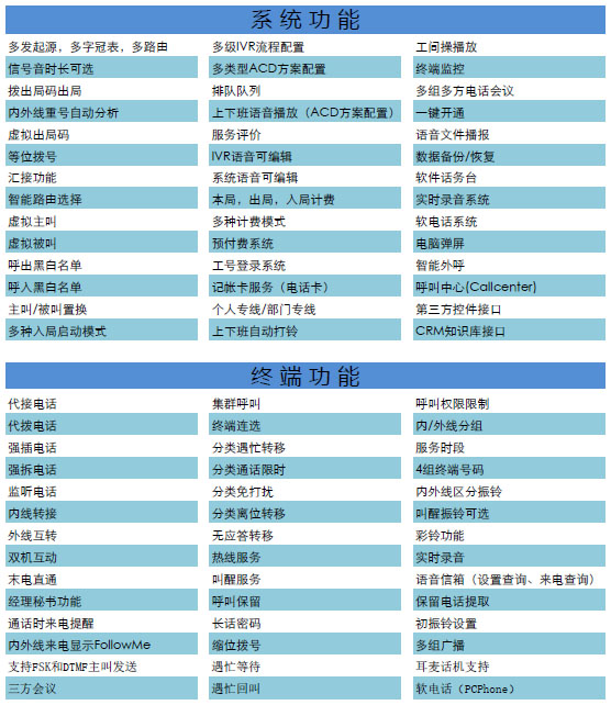 可按客戶需要配置多種管理軟件(參數(shù)設(shè)置、計(jì)費(fèi)系統(tǒng)、錄音系統(tǒng)、軟電話、callcenter等),其功能強(qiáng)大,界面友好。可實(shí)現(xiàn)各類參數(shù)設(shè)置、狀態(tài)實(shí)時(shí)監(jiān)控以及各種功能的實(shí)現(xiàn),是保障和維護(hù)系統(tǒng)正常運(yùn)行的強(qiáng)力支持。