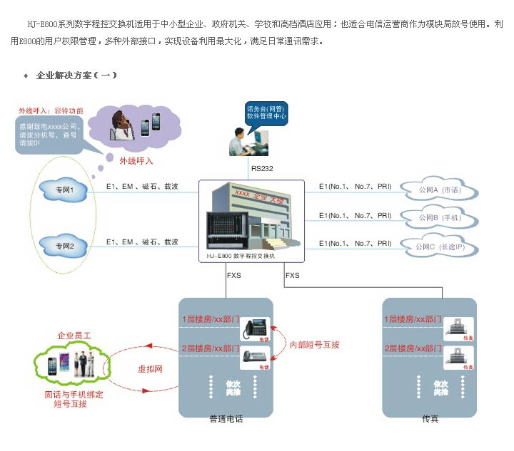 和商務(wù)辦公功能,為企業(yè)解決語音通信需求的同時(shí),提供了更有效的增值應(yīng)用和全新的管理模式。它支持環(huán)路中繼,EM中繼,載波中繼,NO.1,R2,PRI,V5.2等協(xié)議的數(shù)字中繼,支持光接口或者E1接口PCM