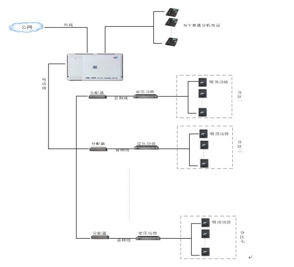 在每個車間分別安裝無源音箱,根據(jù)車間的面積大小確定音箱的數(shù)量,然后把每個車間的無源音箱分別接入功放,每個功放通過威譜廣播適配器實現(xiàn)和威譜交換機分機端口的連接;為每個廣播分機分配一個分機號碼作為廣播的號碼,內(nèi)部其它部門的分機只需撥對應車間的廣播分機號即可方便進行內(nèi)部廣播通知;如果單位領(lǐng)導在單位以外想對車間進行廣播通知,只需要撥威譜交換機外線號碼,經(jīng)交換機電腦話務員,直接撥對應車間的廣播號碼即可。