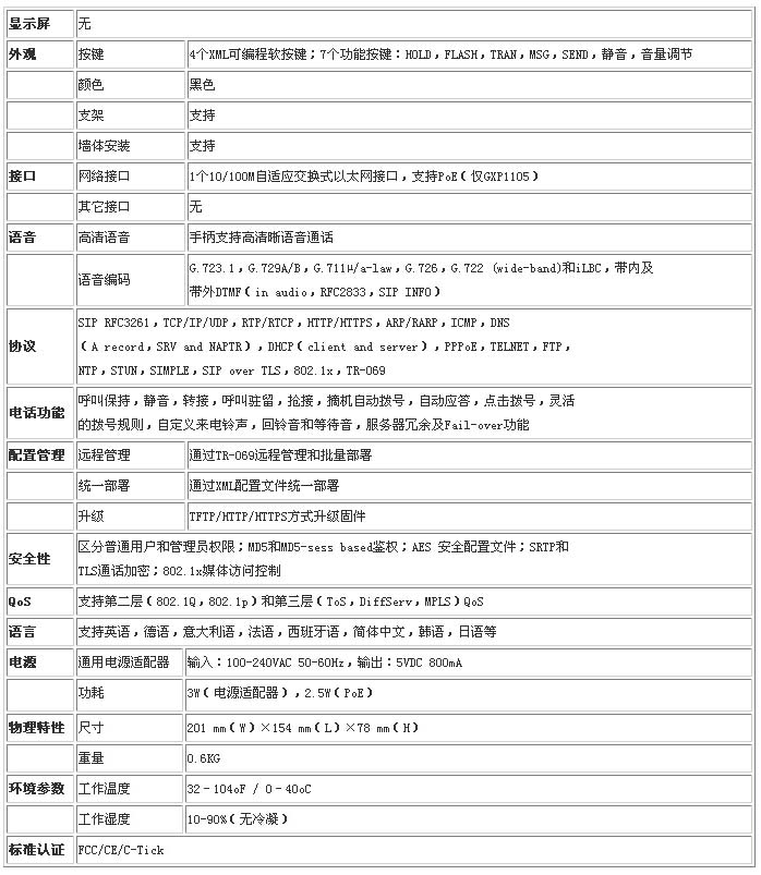 GXP1100/1105是功能豐富的公共區(qū)域IP電話系列,支持一個(gè)獨(dú)立的SIP賬號(hào),兩路通話,4個(gè)XML可編程軟按鍵,采用簡(jiǎn)潔的無(wú)屏設(shè)計(jì),通過(guò)定制的紙卡標(biāo)簽為用戶提供關(guān)鍵信息和操作提示,使用方法簡(jiǎn)單直觀,適用于辦公樓大廳、酒店客房、打印室等公共區(qū)域,為臨時(shí)用戶提供方便快捷的服務(wù)。GXP1100/1105系列具有優(yōu)異的高清語(yǔ)音質(zhì)量和豐富完善的電話功能,支持多種語(yǔ)音編碼,可以為用戶的每次通話帶來(lái)清晰逼真的語(yǔ)音效果。它廣泛兼容第三方SIP設(shè)備及主要的SIP/NGN/IMS平臺(tái),安裝簡(jiǎn)單并可以進(jìn)行批量部署。對(duì)于追求性價(jià)比的小型企業(yè)、酒店和公共區(qū)域用戶,GXP1100/1105系列IP電話是最理想的選擇。