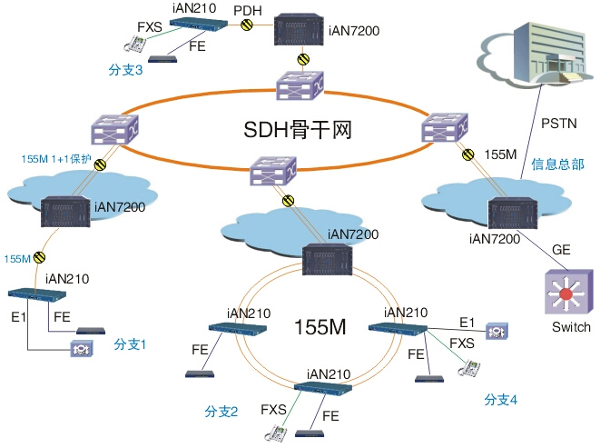 iAN7200利用155M/622M光口替代大量傳統(tǒng)PDH設(shè)備的E1電口或光纖收發(fā)器以太網(wǎng)電口,解決E1銅線或五類線纜過(guò)多而帶來(lái)故障多、維護(hù)成本高的問(wèn)題;通過(guò)將E1、V35、以太網(wǎng)等業(yè)務(wù)轉(zhuǎn)化成VC12進(jìn)行匯聚收斂和統(tǒng)一調(diào)度,為方便靈活的進(jìn)行業(yè)務(wù)配置PDH PCM、協(xié)轉(zhuǎn)、光纖收發(fā)器、GSHDSL等設(shè)備的機(jī)房空間占用成本。