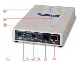 ①電源輸入(DC12V) ②外接 MIC 接口 ③錄音增益旋鈕 ④現(xiàn)場/線路錄音選擇開關(guān) ⑤狀態(tài)指示燈 ⑥線路音頻輸入接口(RJ11) ⑦網(wǎng)絡(luò)接口(RJ45) ⑧手動錄音控制按鈕 ⑨設(shè)備標(biāo)識燈 ⑩內(nèi)置高靈敏集音MIC