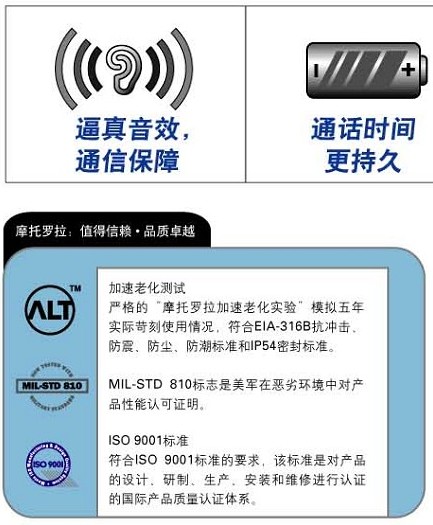 | 平均電池壽命 高容量鋰電池 超薄鋰電池 標準鎳氫電池 鎳鎘電池 | 高功率(4W) 14小時 12小時 10小時 8小時 | 低功率(1W) 19小時 17小時 13小時 10小時 | 密封 | 符合軍標810C,D、E和F,通過IP54防雨實驗 | 沖擊和震動 | 機殼抗壓度符合軍用標準810-C、D、 E和F及TIA/EIA603 | 灰塵和濕度 | 機殼抗壓度符合軍用標準810-C、D、 E和F及TIA/EIA603 |